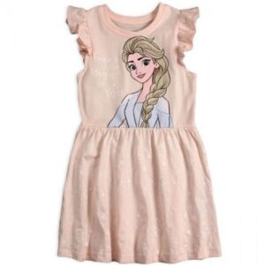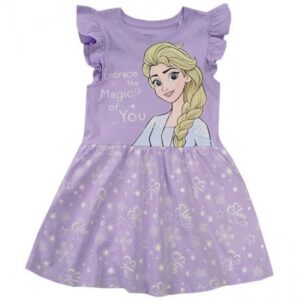 Muinasjutulised kleidid lühikeste kroogitud varrukatega ja Elsa pildiga filmist “Frozen 2”. Pilt on kvaliteetne siiditrükk – see ei murene ega lähe koledaks pesemisel. Alla äärde on trükitud õrnad lumehelbed, tähed ja kiri “Elsa”. Varrukas on lühike ja lõpeb kroogetega. Materjal on 100% puuvill. Värv: helelilla | heleroosa