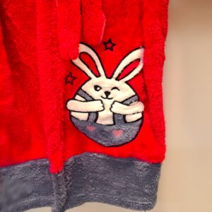 Suuremate laste ja noorte kapuutsiga hommikumantel on vööga. Punast värvi hommikumantlil on käiste otsad ja alumine äär halli värvi, vasakul pool lõbus jänese embleem. Materjal 100% paksem karvastatud puuvillafliis.