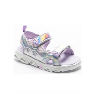 DO sandaalid on valmistatud vastupidavast ja pehmest sünteetilisest materjalist, mida ilmestavad läikivad detailid jala peal ja taga kannal. Liikumisel värvub tald vilkuvaks. Lihtsa vaevaga kahe käepärase takjakinnitusega jalga reguleeritavad. Sisemus on tekstiilist ja sisetald pehme vahukattega sünteetilisest materjalist. Välistald on kummine ja hea painduvusega, kus väliskülje süvendites paiknevad tulukeste pirnid. Värv: hõbedane helelilla.