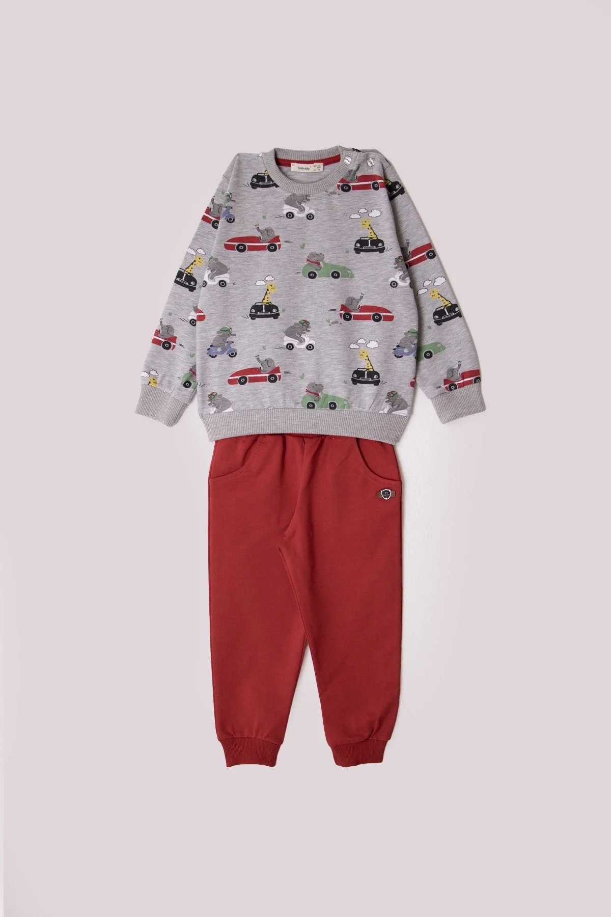 Kaheosaline komplekt väikelastele. Automustriga dressipluus ja ühevärvilised püksid. Materjal: 95% puuvill | 5% elastan.