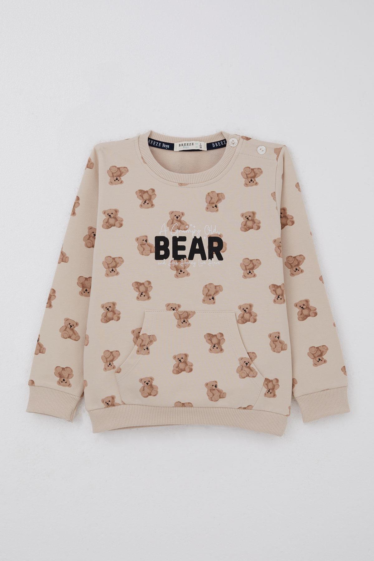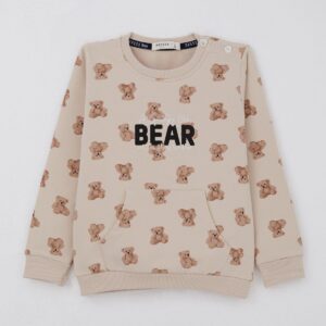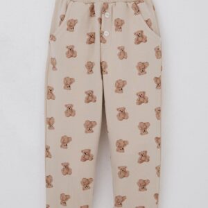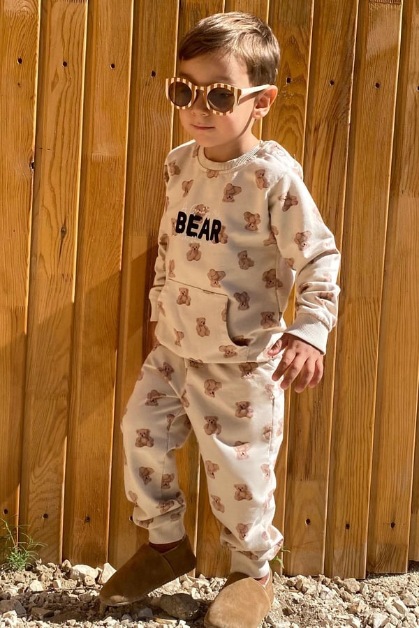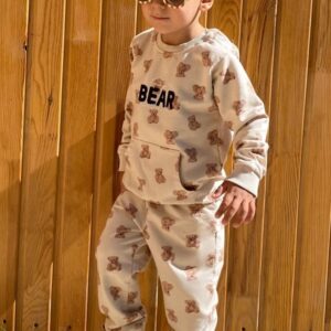 Väikelaste dressikomplekt on õmmeldud mõmmi mustriga puuvillasest pehmest ja soojast kangast. Dressipluusil õlal 2 nööpi ja esitasku. Kaeluses, varruka otstes ja all ääres soonik. Pükstel kaks taskut, keskkohas ja pükste all ääres soonik.